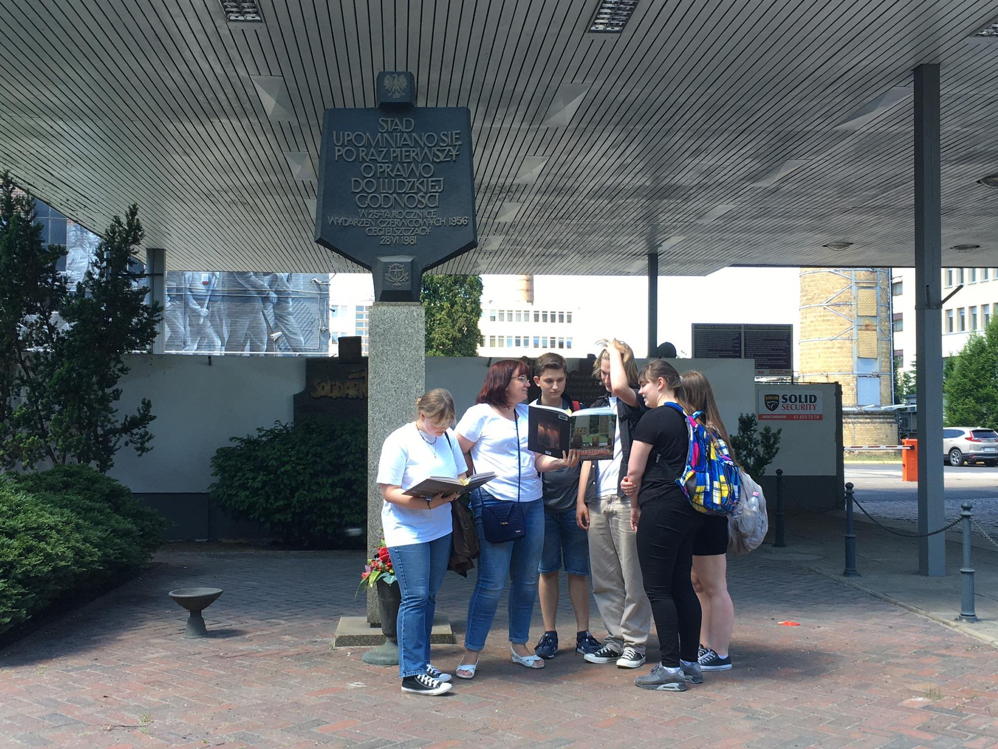 Z okazji zbliżającej się rocznicy Poznańskiego Czerwca uczniowie naszej szkoły przeszli ulicami miasta pokonując trasę jaką 66 lat temu maszerowali ich dziadkowie. Czy wiecie, że ALBERT CAMUS, w dniu 12 lipca 1956 roku wygłosił w Paryżu przemówienie na wiecu solidarności z robotnikami Poznania. Oto fragment jego wystąpienia:” Jeśli chodzi o mnie, wystrzegać się będę zawsze zachęcania w najmniejszym nawet stopniu do walki i do buntu ludzi, w których walce nie mogę brać udziału. Lecz teraz, gdy ludzie ci u kresu poniżeń zbuntowali się, a potem zostali zamordowani – czułbym sam do siebie pogardę, gdybym ośmielił się wykazać najmniejszą powściągliwość w ocenie tego morderstwa i nie wyrazić całego mojego szacunku dla ofiar represji i całkowitej z nimi solidarności…” A było tak….W 1956 roku warunki życia rodzin robotniczych były bardzo złe, a wynagrodzenie za ciężką pracę nie wystarczało na godne życie. W Poznaniu dużym wówczas ośrodku przemysłowym narastało społeczne niezadowolenie. Załoga największego zakładu poznańskiego, tj. Cegielskiego (Hipolit Cegielski Poznań) domagała się, aby władze cofnęły narzucone normy pracy, obniżyły ceny i podwyższyły płace Pierwszy etap robotniczego buntu trwał od godziny 6.00 do 10.30. W tym czasie robotnicy zorganizowali strajk w największych zakładach miasta. Następnie wyszli na ulice formując pochód, który przekształcił się z demonstracji robotniczej w manifestację społeczeństwa, czego wyrazem było zgromadzenie się około 100 tys. mieszkańców przed Prezydium Miejskiej Rady Narodowej, mieszczącym się w dawnym Zamku Cesarskim, przy obecnej ulicy Święty Marcin. Poznański czerwiec pochłonął 58 ofiar w tym 50 cywilów, 4 żołnierzy, 1 milicjanta i 3 funkcjonariuszy UB. Wśród 50 ofiar cywilnych, aż 13 z nich nie miało ukończonych 18 lat. Najmłodszą ofiarą Poznańskiego Czerwca 1956 był 13-letni Romek Strzałkowski, który stał się symbolem poznańskiego buntu. 600 rannych. Ogółem aresztowano ok. 250 osób, w tym 196 robotników. Intensywne śledztwo połączone z biciem i maltretowaniem podejrzanych, prowadzone przez liczną grupę funkcjonariuszy z Warszawy, miało potwierdzić tezę władz, że sprawcami wydarzeń 28 czerwca byli prowokatorzy z opozycyjnych organizacji i obca agentura.