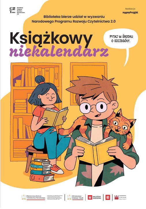 „Książka – stosuj codziennie” – to projekt realizowany w ramach Narodowego Programu Rozwoju Czytelnictwa. Nasza biblioteka przystąpiła do tej ogólnopolskiej akcji. Na czym polega udział w tym wydarzeniu? Na każdy miesiąc 2024 r. przygotowane zostały specjalne plakaty – kartki z kalendarza z wyznaczonymi wyzwaniami czytelniczymi. Jest to wyjątkowy „Książkowy NIEkalendarz ”. Plakaty będą udostępniane na szkolnym fb i na stronie www oraz eksponowane na bibliotecznych tablicach ogłoszeń. Początek roku to dobry czas na podejmowanie różnych wyzwań i postanowień, tych czytelniczych również. Osoby, które przystąpią do wykonywania comiesięcznych aktywności czytelniczych otrzymają w bibliotece specjalną kartę, na którym będą zaznaczać zrealizowane wyzwania. Na wytrwałych czekają nagrody. Więcej informacji na temat akcji uzyskasz w bibliotece.