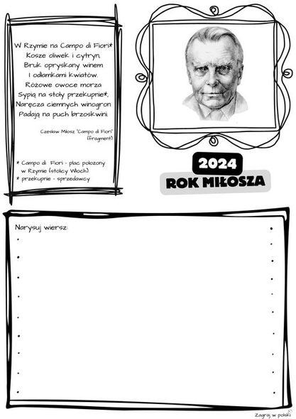 Serdecznie zapraszamy do udziału w konkursie. Chcielibyśmy, abyście pokazali nam swoją wizję wybranego przez Was utworu Czesława Miłosza. Do końca miesiąca czekamy w bibliotece na prace plastyczne (format i technika dowolna!), które będą jednocześnie wypełnieniem 3 punktu marcowego niekalendarza. Możesz skorzystać z naszych podpowiedzi, przyjść do biblioteki po tomik poezji noblisty, a może masz coś na swojej półce…Narysuj, to co przeczytasz