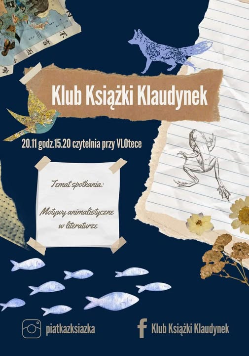 Zapraszamy serdecznie na kolejne spotkanie Klubu Książki Klaudynek, które odbędzie się 20 listopada o godzinie 15:20 w czytelni koło VLOteki. Tematem kolejnego spotkania są motywy animalistyczne w literaturze . Do zobaczenia wkrótce!